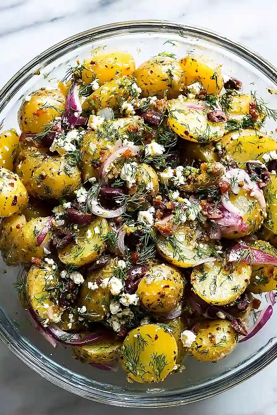 Once the potatoes have cooled slightly, add the pitted kalamata olives, thinly sliced red onion, chopped sun-dried tomatoes, capers, and roughly chopped fresh dill to the potatoes. Pour the prepared dressing (from Step 2) over the ingredients and gently toss everything together until well combined. Taste and adjust the seasoning with more salt and pepper if needed. Top with crumbled feta cheese just before serving. I like to let the salad rest for at least an hour before serving so the potatoes really soak up all the tangy dressing.